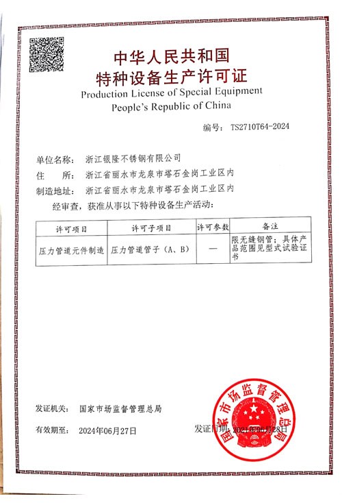浙江銀隆不銹鋼有限公司創始于2006年,是一家專業生產不銹鋼無縫管的企業。公司位于浙江麗水市,企業注冊總資金貳億壹仟柒佰肆拾玖萬元,擁有4家工廠,占地總面積11萬平方米,職工530人,年產不銹鋼無縫管5萬噸。